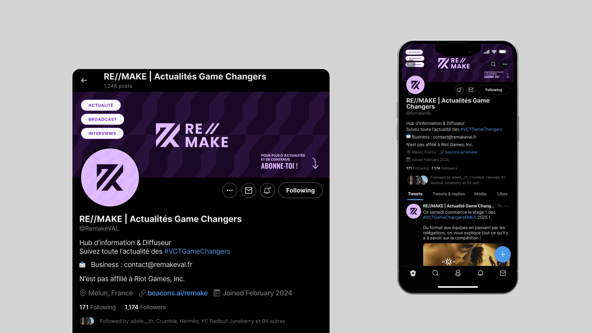 RE//MAKE is a French news media dedicated to the women's VALORANT esports scene. Its mission is to spotlight players, teams, and the latest news in competitive play.